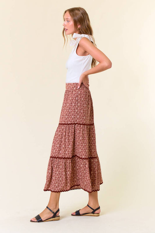 Geo Floral Rick Rack Maxi Skirt in Terracotta