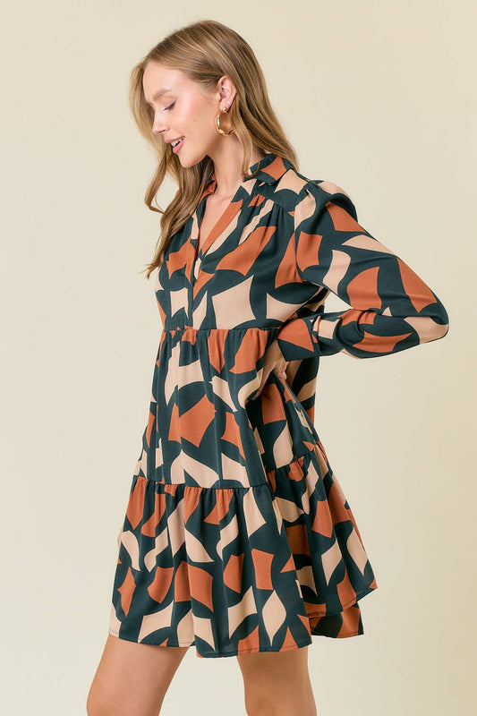 Abstract Print Long Sleeve Tiered Mini Dress in Hunter Green