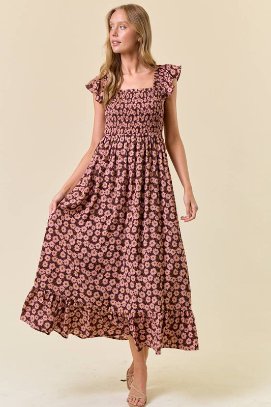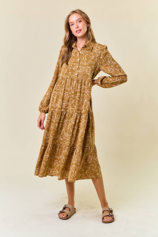 Button Down Long Sleeve Tiered Midi Dress in Camel