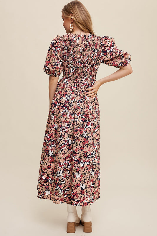 Flower Print Smocked Maxi Dress in Navy with Pink Flowers - FINAL SALE