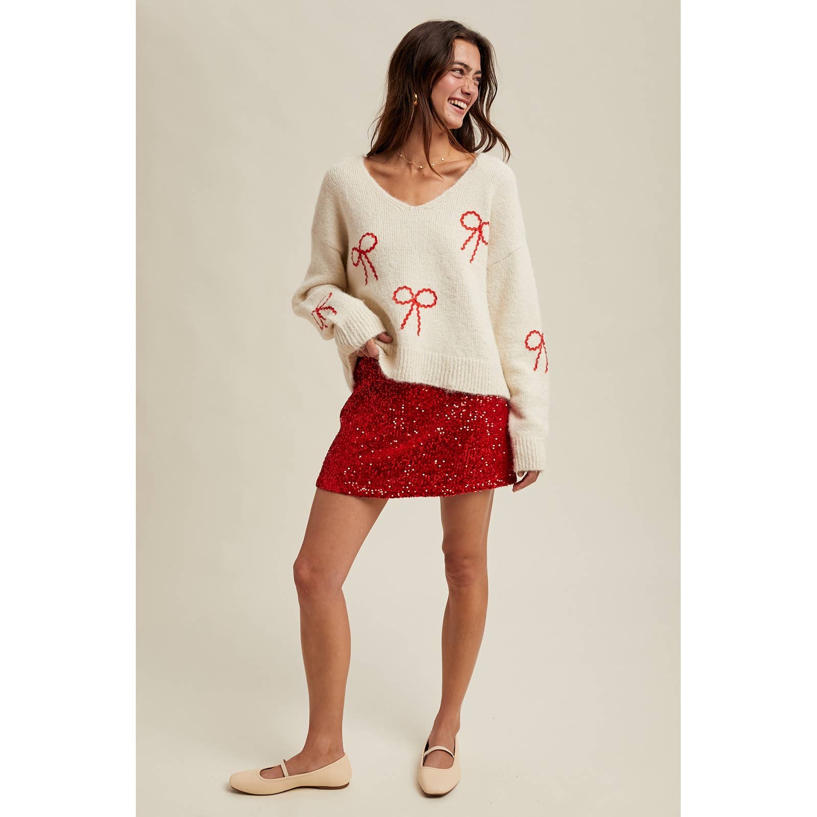 The Embellished 'Bow' Drop Shoulder Sweater combines comfort and style with a chic bow detail and relaxed fit, perfect for any occasion and even greater for the holidays.