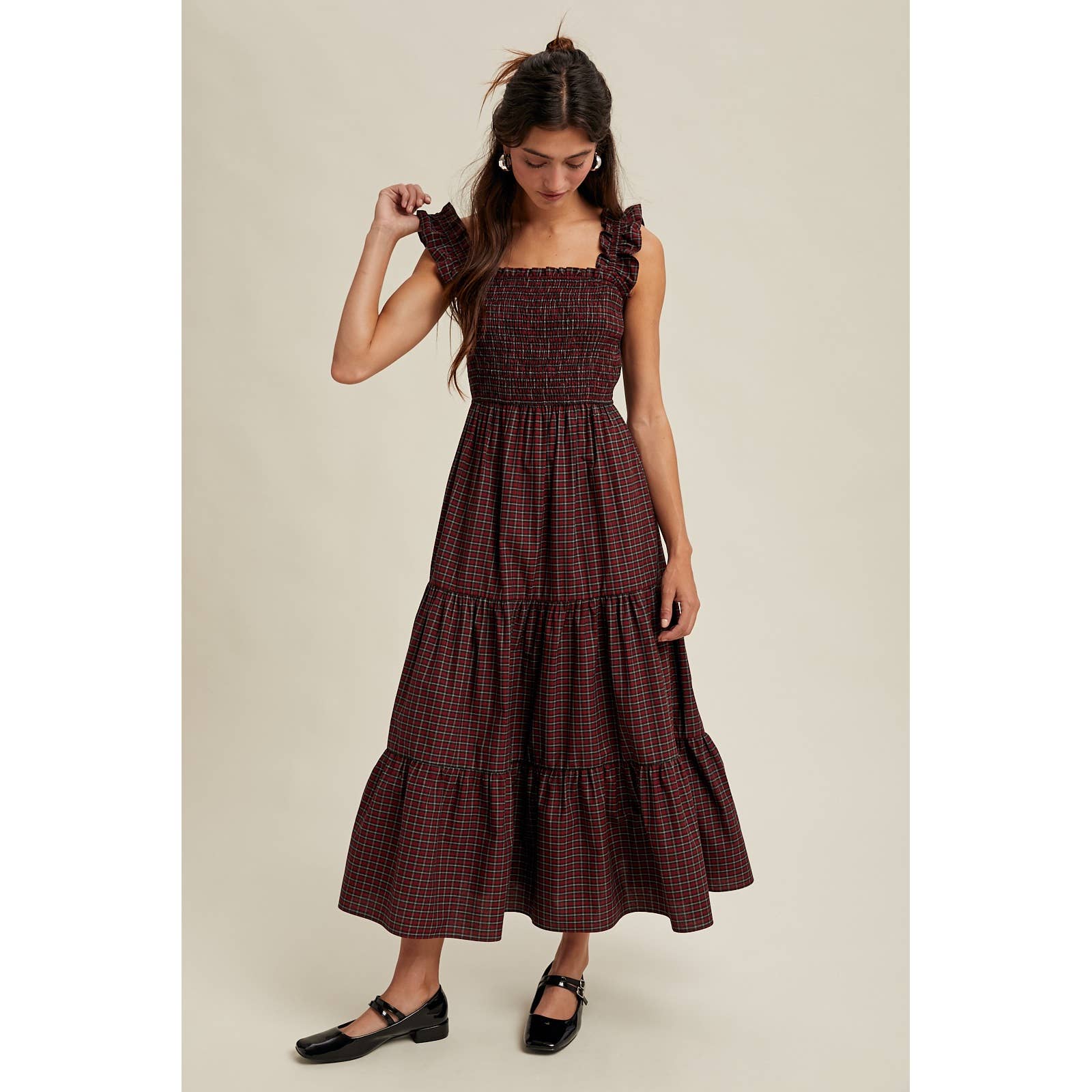 - Flirty and feminine, this gingham midi dress features ruffle sleeves and a tiered skirt, creating a breezy, flattering look perfect for the holidays or any occasion. Effortless charm in every step!